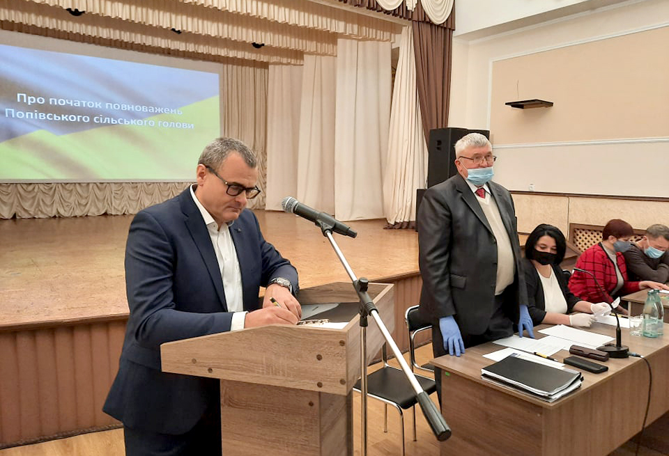 Голова Попівської сільської територіальної виборчої комісії урочисто вручив посвідчення сільського голови Попівської сільської ради Анатолію Боярчуку, привітавши його з обранням на посаду, та посвідчення новообраним депутатам.